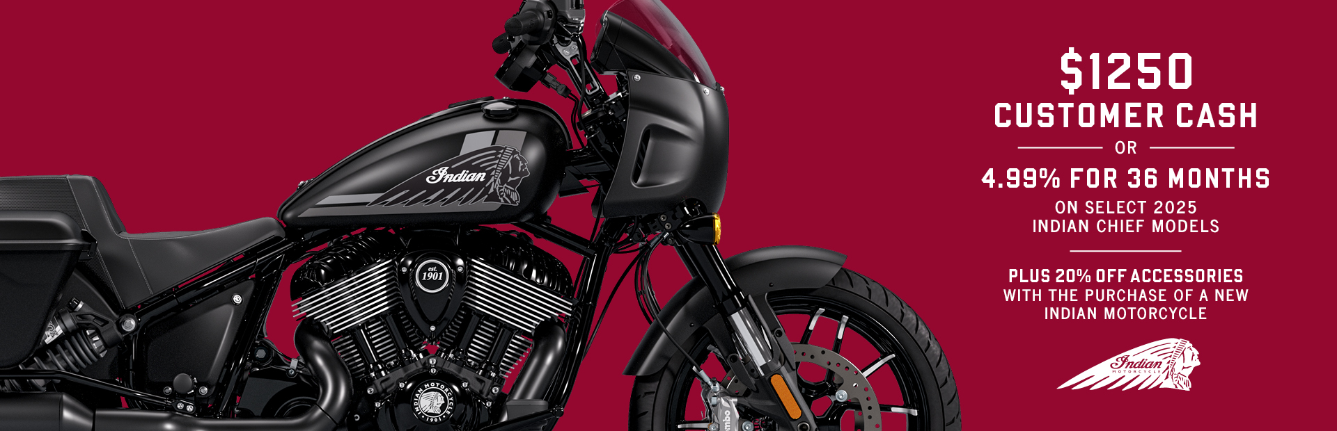 This is a limited time offer which consists of $750 Customer Cash rebate towards the purchase of new model year 2025 Chief: Chief, Chief Dark Horse, Chief Bobber, Chief Bobber Dark Horse, Sport Chief or Super Chief Limited model. This offer is subject to change and may be extended or terminated without further notice. Offer may not be combined with promotional financing offers. All rebates paid to dealer and are not redeemable for cash. Offer Valid: January 1 – 31, 2026.
