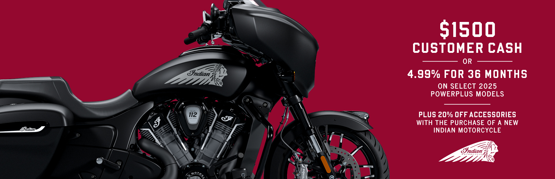 This is a limited time offer which is valid for the purchase of selected qualifying models and is subject to credit approval on qualified purchases financed during this program. Offer may not be combined with certain other offers (specifically trade-in credit or customer cash), is subject to change and may be extended or terminated without further notice. Offer valid on select new 2025 models (excludes Elites): MY25 Indian Springfield models, MY25 Chieftain models, MY25 Roadmaster models, MY25 PowerPlus family (Chieftain PowerPlus, Roadmaster PowerPlus, Indian Challenger, or Indian Pursuit), or MY25 Chief models (2025 Indian Chief, Chief Bobber, Super Chief and Sport Chief models). Monthly payment and cost of borrowing will vary depending on amount borrowed and down payment/trade. Minimum financing amount varies, check with your Indian Motorcycle dealership for minimum financing details. Example: $14,999 financed at 4.99% APR over 36 months = 36 monthly payments of $379; financed amount of $13,499 with 10% down payment, total cost of borrowing of $1,064 and a total obligation of $14,563. An example of monthly payments required on a 36-month term at 4.99% APR is $29.97 per $1,000 financed. Monthly payment examples do not include taxes, title, and other fees. Offer only valid to qualified customers, not all customers will qualify, other offers available, see dealer for details. Excludes all Elite Models. Offer Valid: January 1 – 31, 2026."