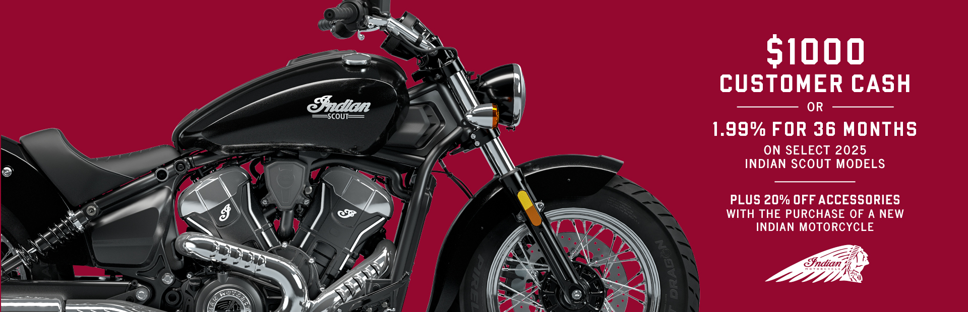 This is a limited time offer which consists of $500 Customer Cash rebate towards the purchase of new model year 2025 Scout Bobber, Super Scout, 101 Scout, or Scout Sixty Bobber Limited. This offer is subject to change and may be extended or terminated without further notice. Offer may be combined with promotional financing offers. All rebates paid to dealer and are not redeemable for cash. Offer Valid: January 1 – 31, 2026.