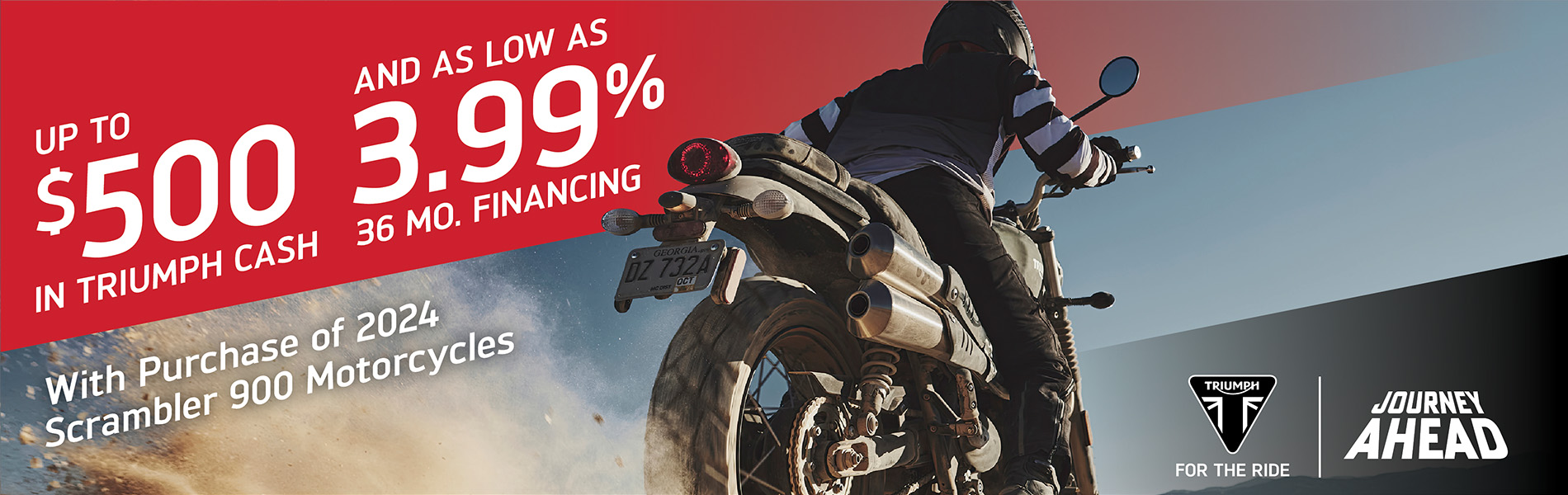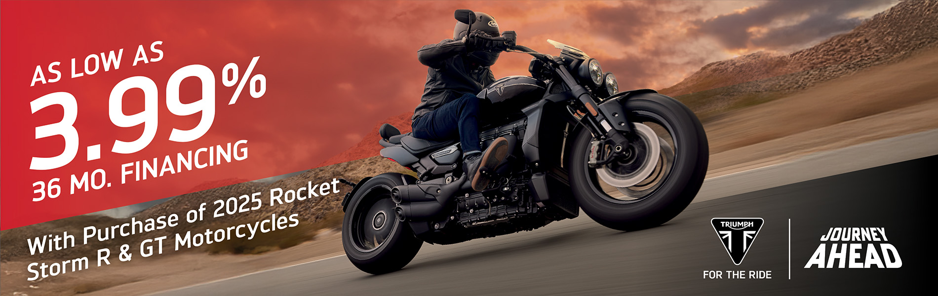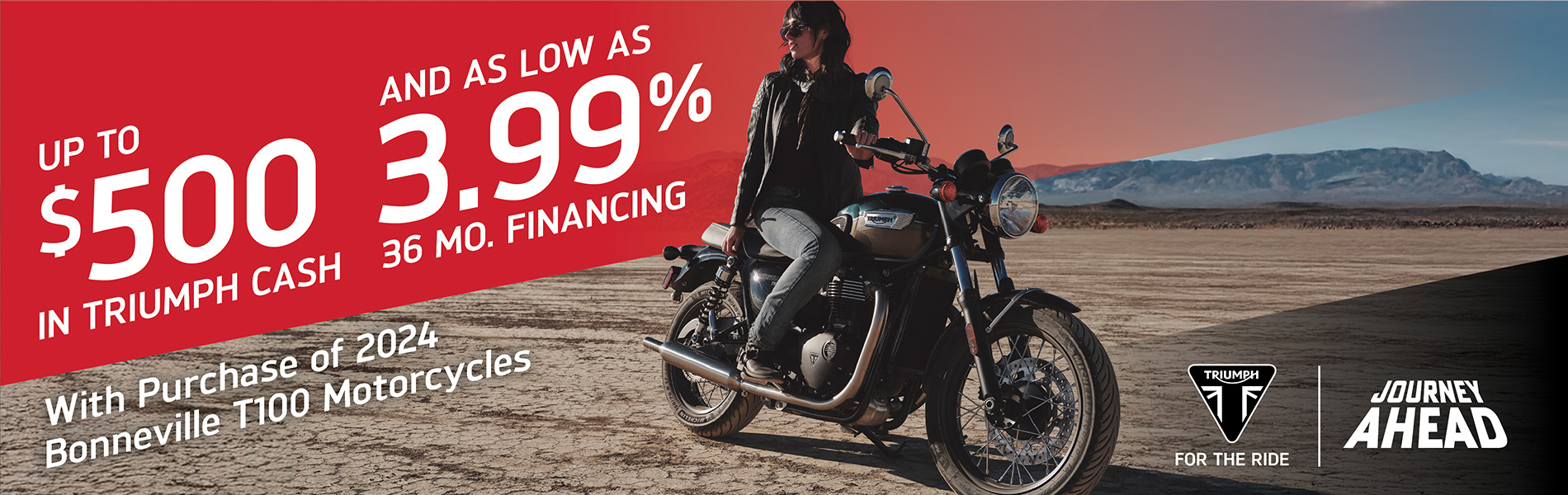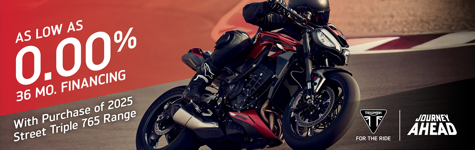 The Journey Ahead promotion offers bold incentives for riders to start their next motorcycle journey on a new Triumph motorcycle, including the ability to pair Triumph Cash with Retail Financing options. Below is a summary of the November offers.