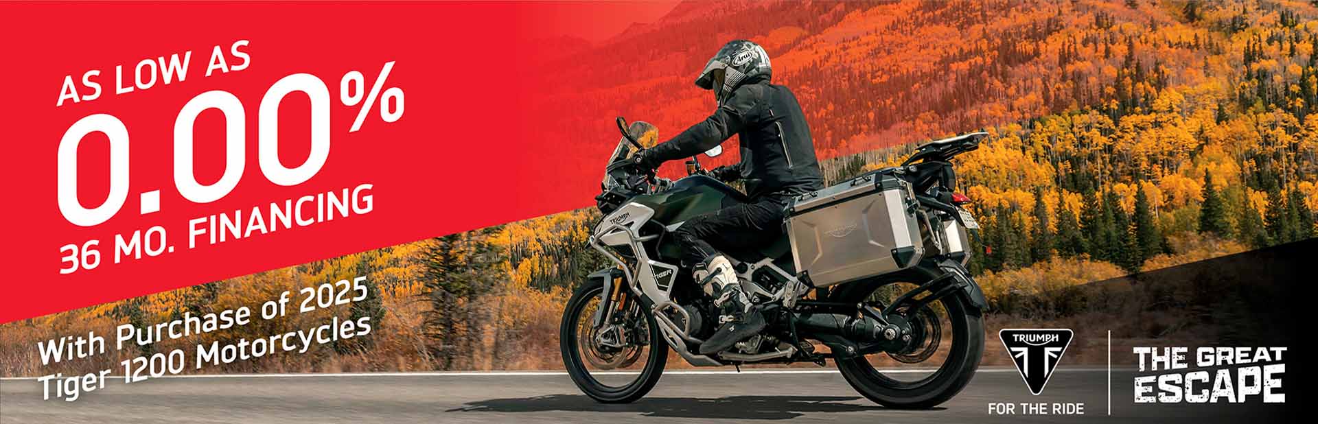 The Great Escape promotion offers bold incentives for riders to escape high interest rates on the purchase of a new Triumph motorcycle, with the lowest financing rates in the industry. Below is a summary of the January offers.
